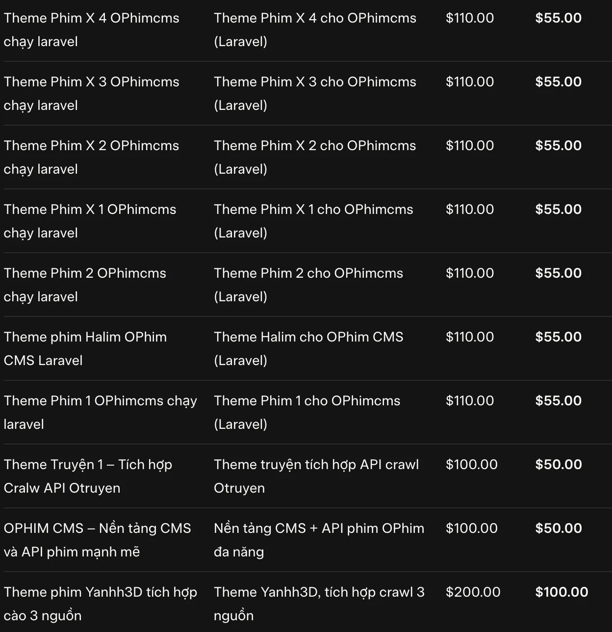 Dưới đây là danh sách sản phẩm nổi bật (dựa trên thememovies.net), giá gốc và giá sau giảm 50% (tất cả bằng USD). Áp dụng ngay hôm nay!