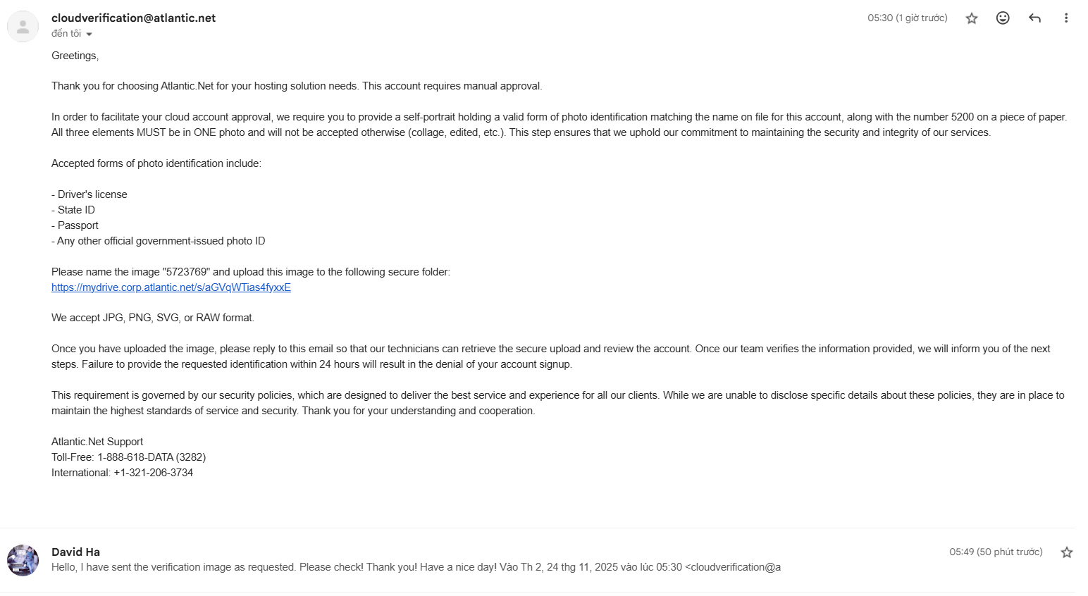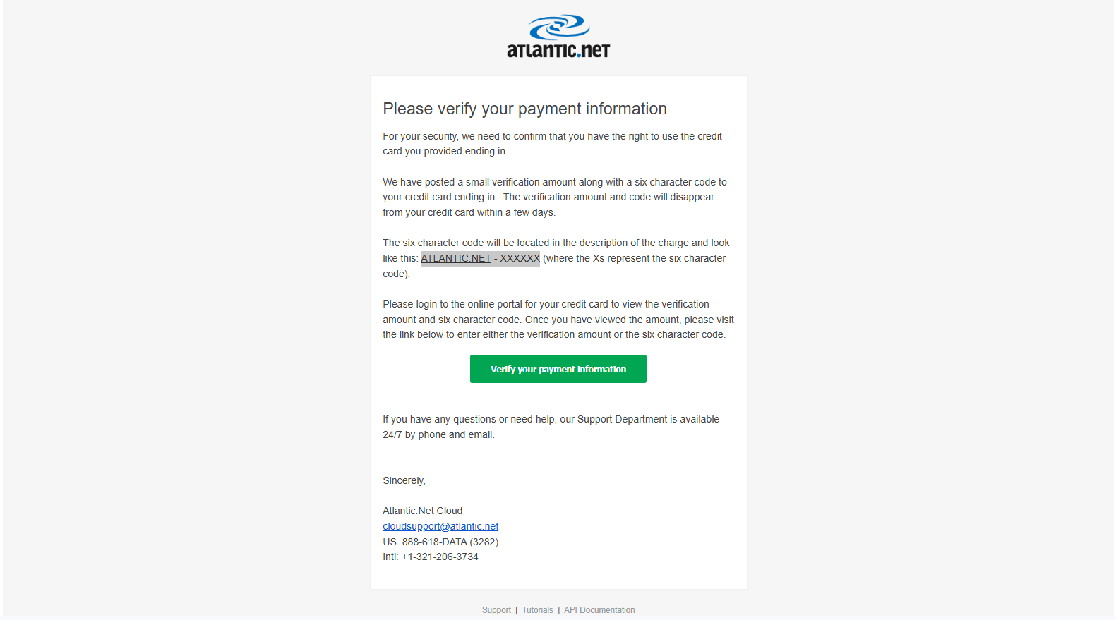 - Sau khi nhập thông tin thẻ (Credit/Debit), Atlantic.net sẽ trừ thử một khoản rất nhỏ hoặc gửi mã kiểm tra gồm 6 chữ số tới email hoặc thông báo ngân hàng.